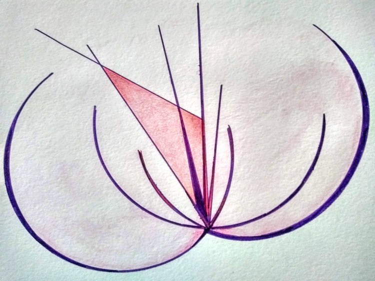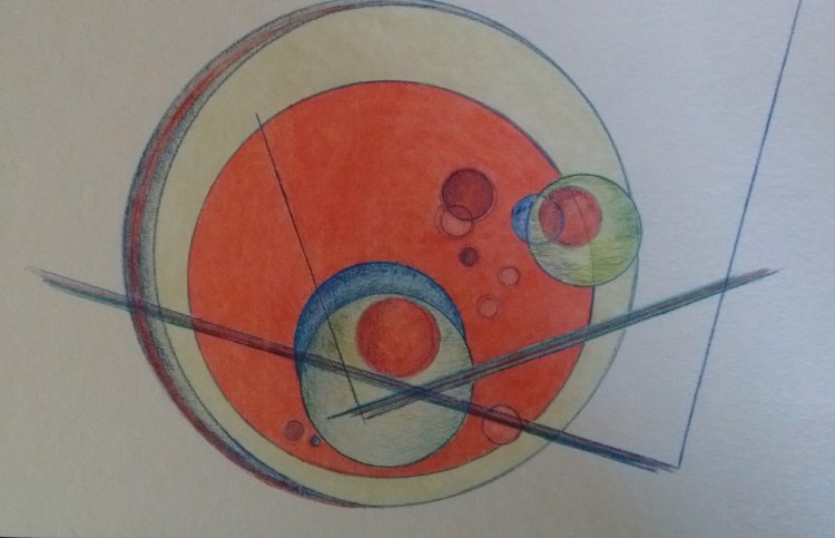 As she developed skill in this medium Ellen moved away from realistic work, especially flowers, to more abstract forms. In many works Ellen tries to bring contrasting colors, dark ink touching light yellow, soft pink with a touch of deep red She also uses contrasting shapes, the round circle with the single straight line. A sharp dark line penetrating the soft cloud.